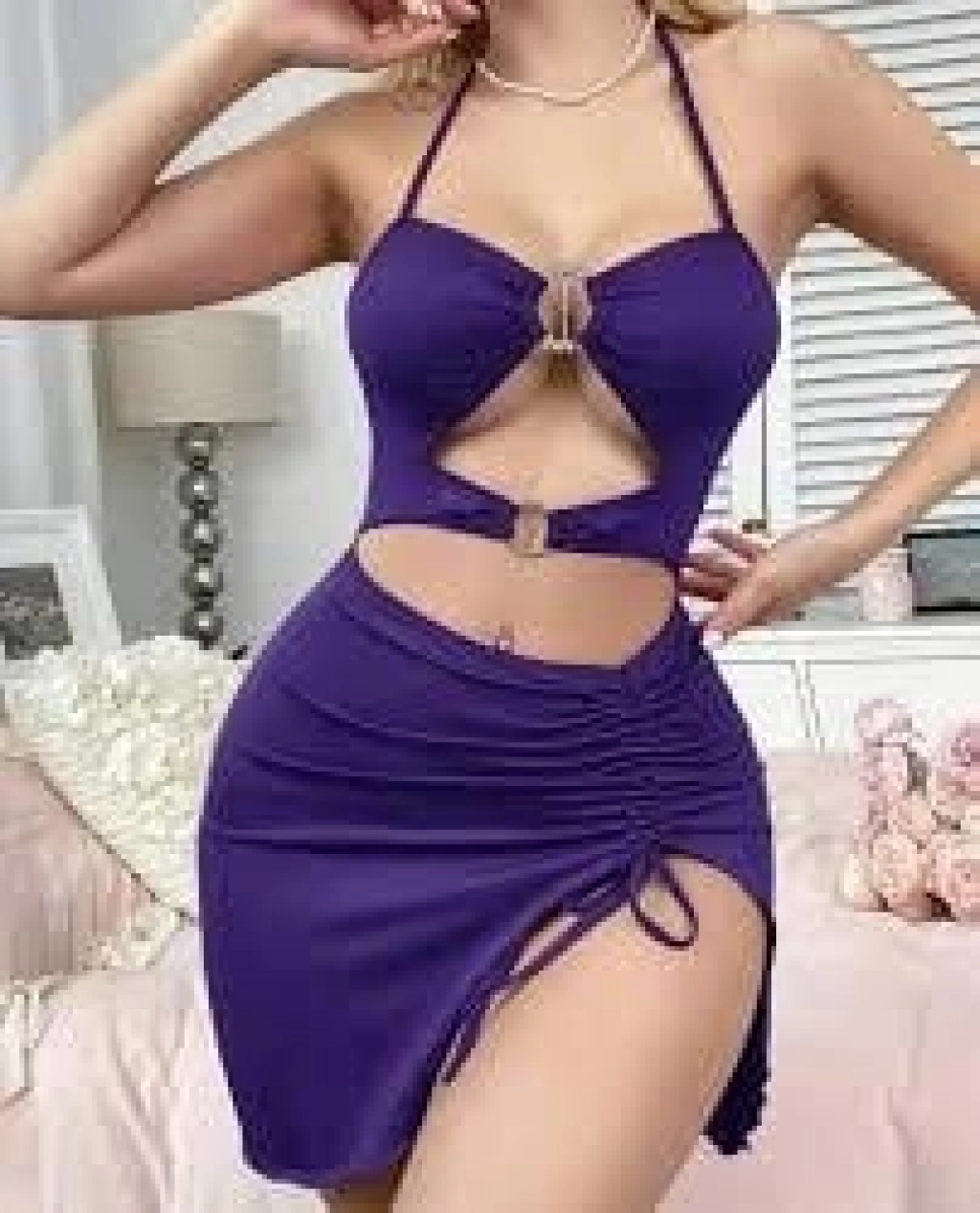 Mor Halka Detaylı Boyundan Bağlamalı Fantezi Elbise 5139
