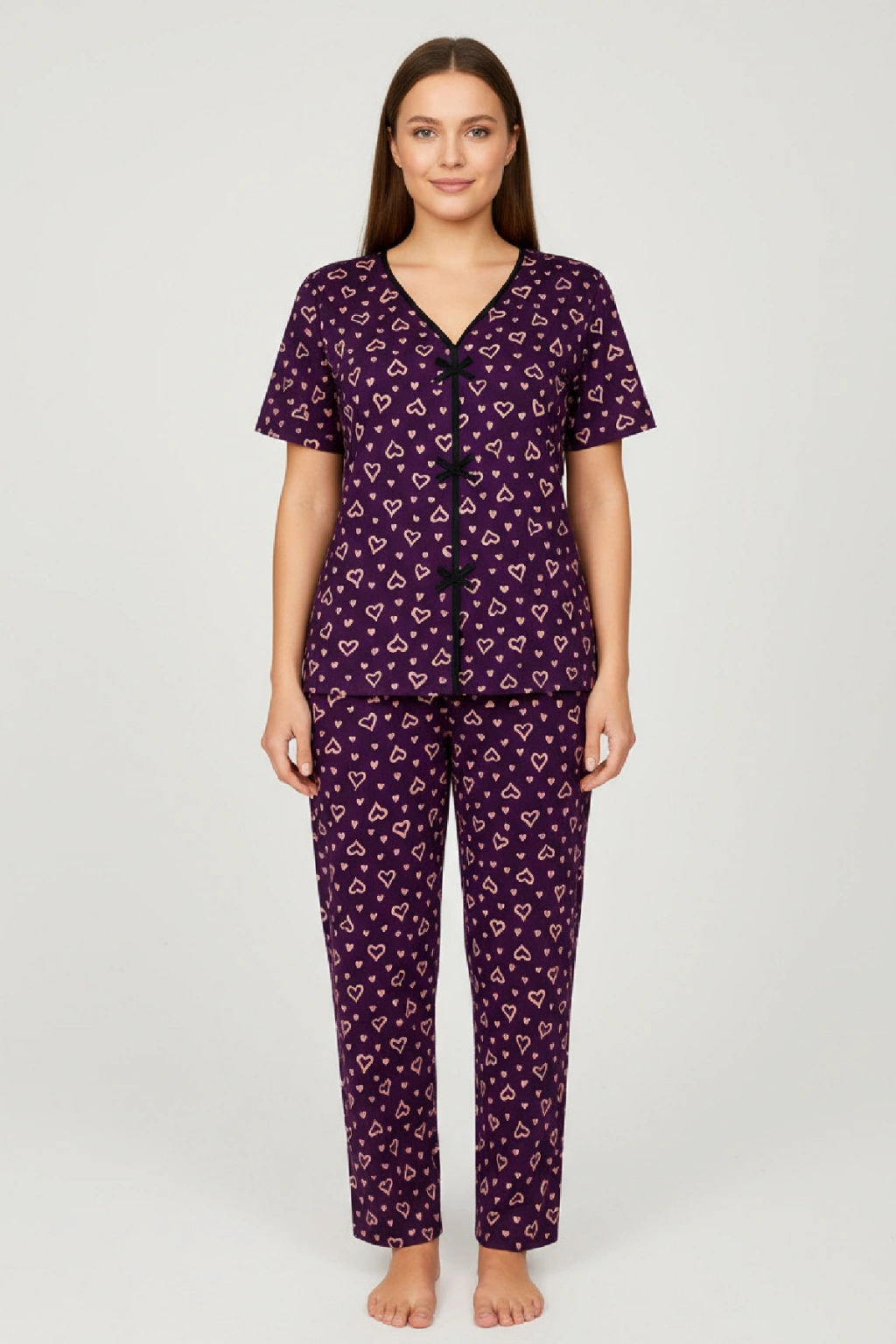 Kadın Mor Kalp Desenli Fiyonklu Kısa Kollu Uzun Pijama Takımı