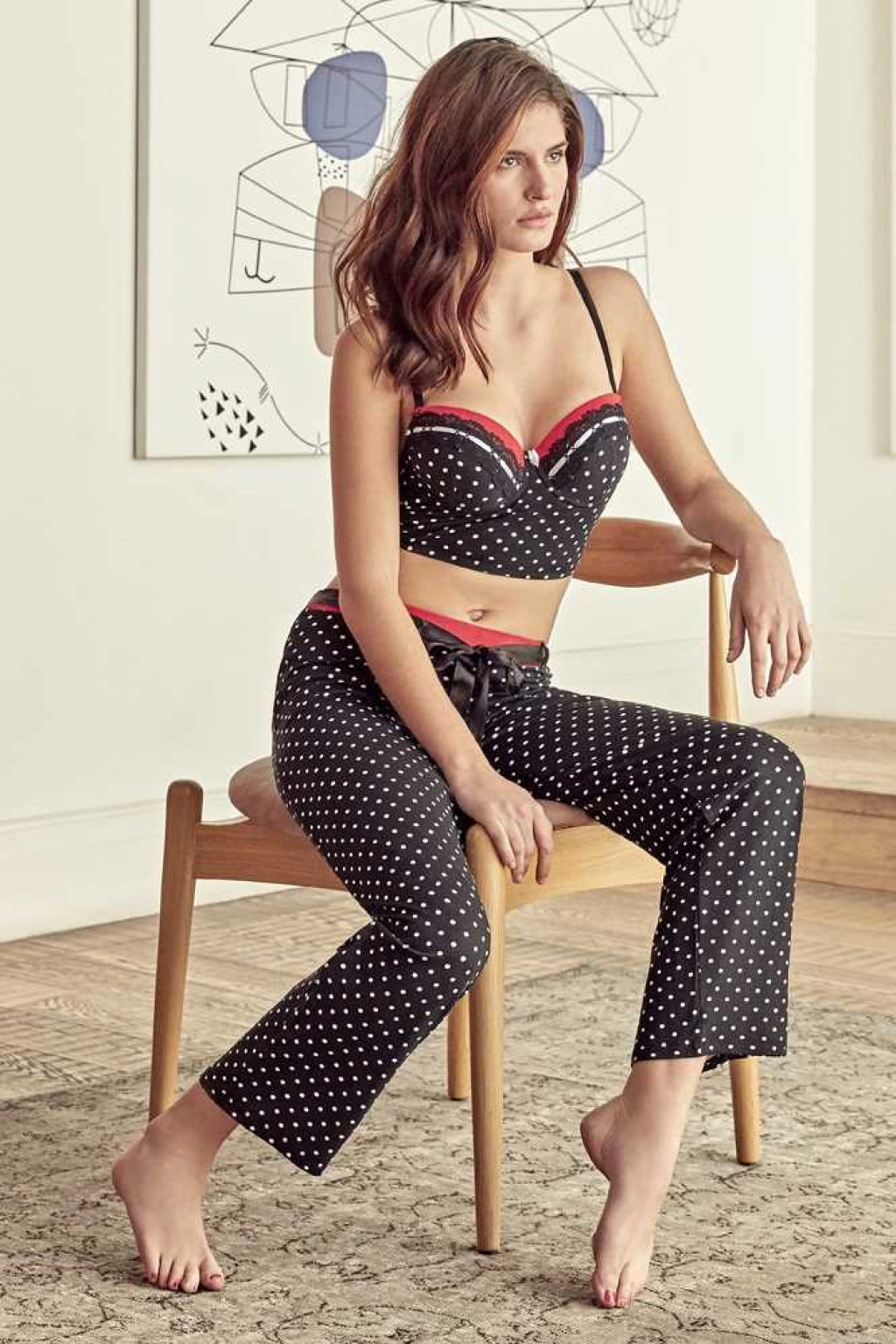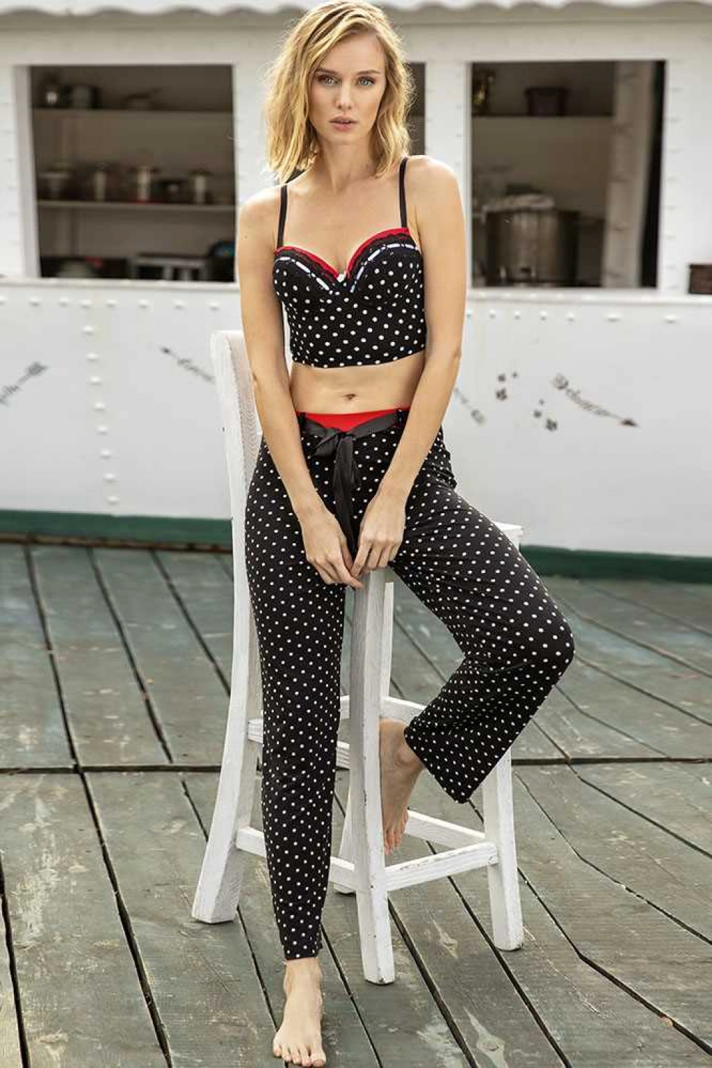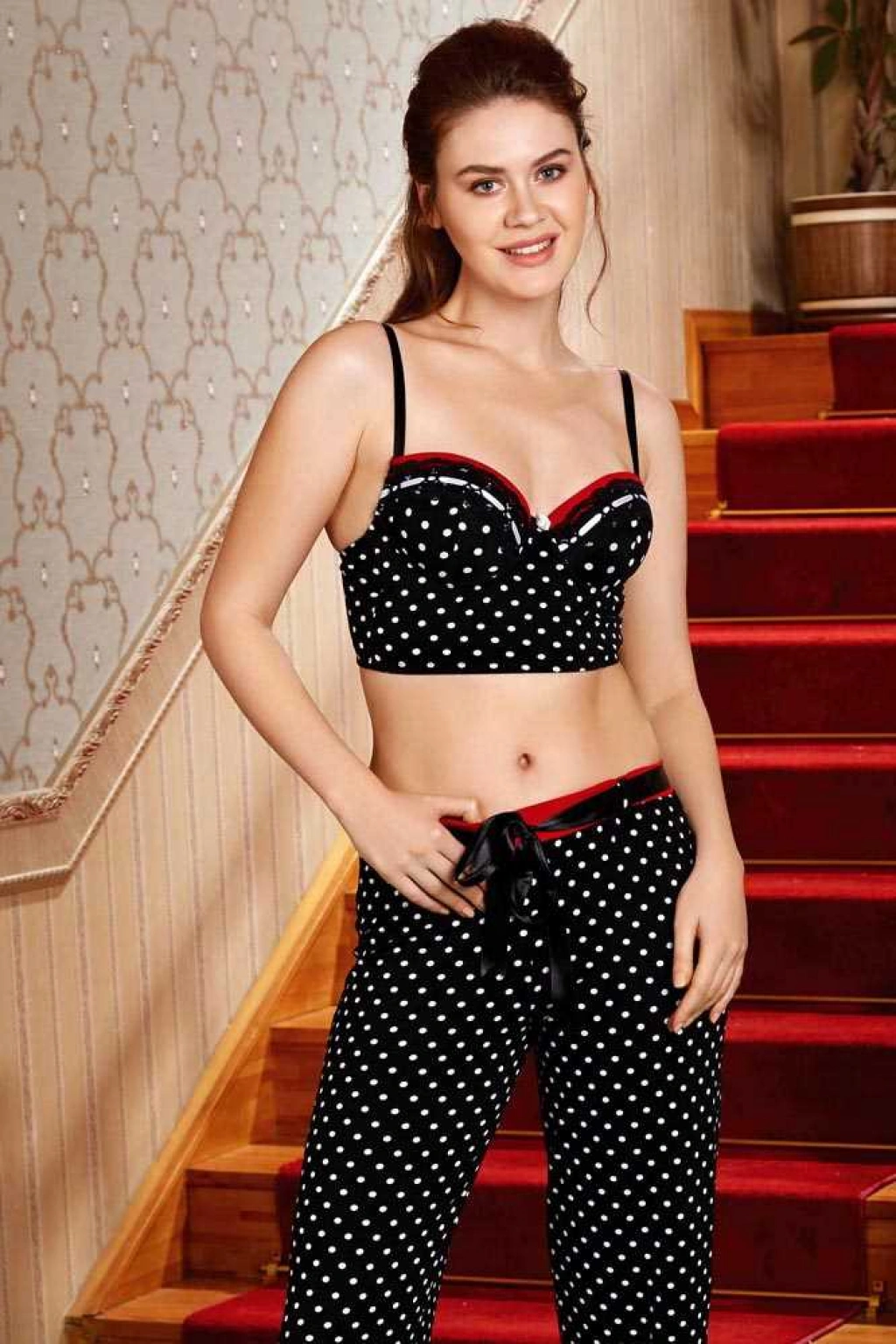 • Kadın Viskon Balenli Destekli Dolgulu Puantiyeli Büstiyer Ve Pantolon Pijama Takım