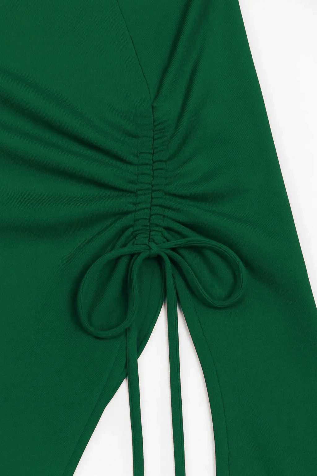 Modern çizgilerle tasarlanmış Kadın Yeşil Asimetrik Yaka Drapeli Yan Bağlamalı Uzun Kollu Bluz, doğadan ilham alan tonuyla sofistike bir zarafet sunar.Asimetrik yakası omuz hattını zarifçe öne çıkarırken, yan bağlama detayı vücuda oturan formu destekler ve dengeli bir siluet oluşturur.Drapeli kumaş yapısı, bedeni narin bir şekilde sarar ve gün boyu rahatlık sağlar.Yeşilin dingin ama güçlü tonu, stilinize modern bir ferahlık katar.Kaliteli, esnek dokusu sayesinde hem gündüz hem gece kombinlerine mükemmel uyum sağlar.Bahar ve sonbahar mevsimlerinde stil kurtarıcınız olacak bu parça, şıklığı ve rahatlığı aynı anda sunar.Uzun, volanlı kolları feminen bir detay kazandırırken; dalgalı etek ucu tasarıma modern bir hareketlilik katar.Hem ofis kombinlerinde hem hafta sonu stilinizde rahatlıkla kullanabilirsiniz.Öne Çıkan ÖzelliklerRenk: YeşilYaka Tipi: Asimetrik, tek omuz açıkKol Tipi: Uzun, volanlı (hafif geniş) kolDetay: Drapeli, yan bağlamalı, vücuda oturan tasarımKumaş: Esnek, dökümlü ve nefes alabilir kumaşSezon: Bahar / SonbaharStil: Şık – Feminen – GünlükStil ÖnerileriGündüz Şıklığı İçin:Açık tonlu pantolon ve bej ayakkabılarla doğal ama etkileyici bir görünüm yakalayın.Altın takılarla kombini zenginleştirin.Ofis Stili İçin:Krem veya beyaz yüksek bel pantolonlarla kombinleyin.Minimal aksesuarlarla sade ve zarif bir duruş oluşturun.Akşam Şıklığı İçin:Siyah deri tayt veya saten eteklerle güçlü bir kontrast yaratın.Topuklu ayakkabılar ve gold detaylı takılarla görünümünüzü tamamlayın.Romantik Dokunuşlar İçin:Pastel tonlarda midi etek ve küçük el çantasıyla zarif bir kombin oluşturabilirsiniz.Günlük Rahat Kombin:Jean pantolon ve sneaker’larla rahat ama şık bir hafta sonu tarzı elde edin.Neden Tercih Etmelisiniz?Yeşilin zarif ve modern tonuyla doğadan ilham alan bir stil yaratır.Asimetrik yaka ve drapeli detaylar modern bir şıklık sunar.Vücuda oturan form, feminen bir siluet oluşturur.Gündüzden geceye kullanılabilecek çok yönlü bir tasarım.Kadın Yeşil Asimetrik Yaka Drapeli Yan Bağlamalı Bluz, doğanın huzurunu ve modern zarafeti buluşturuyor.Stilinize taze bir dokunuş katmak için ideal parça!]]>