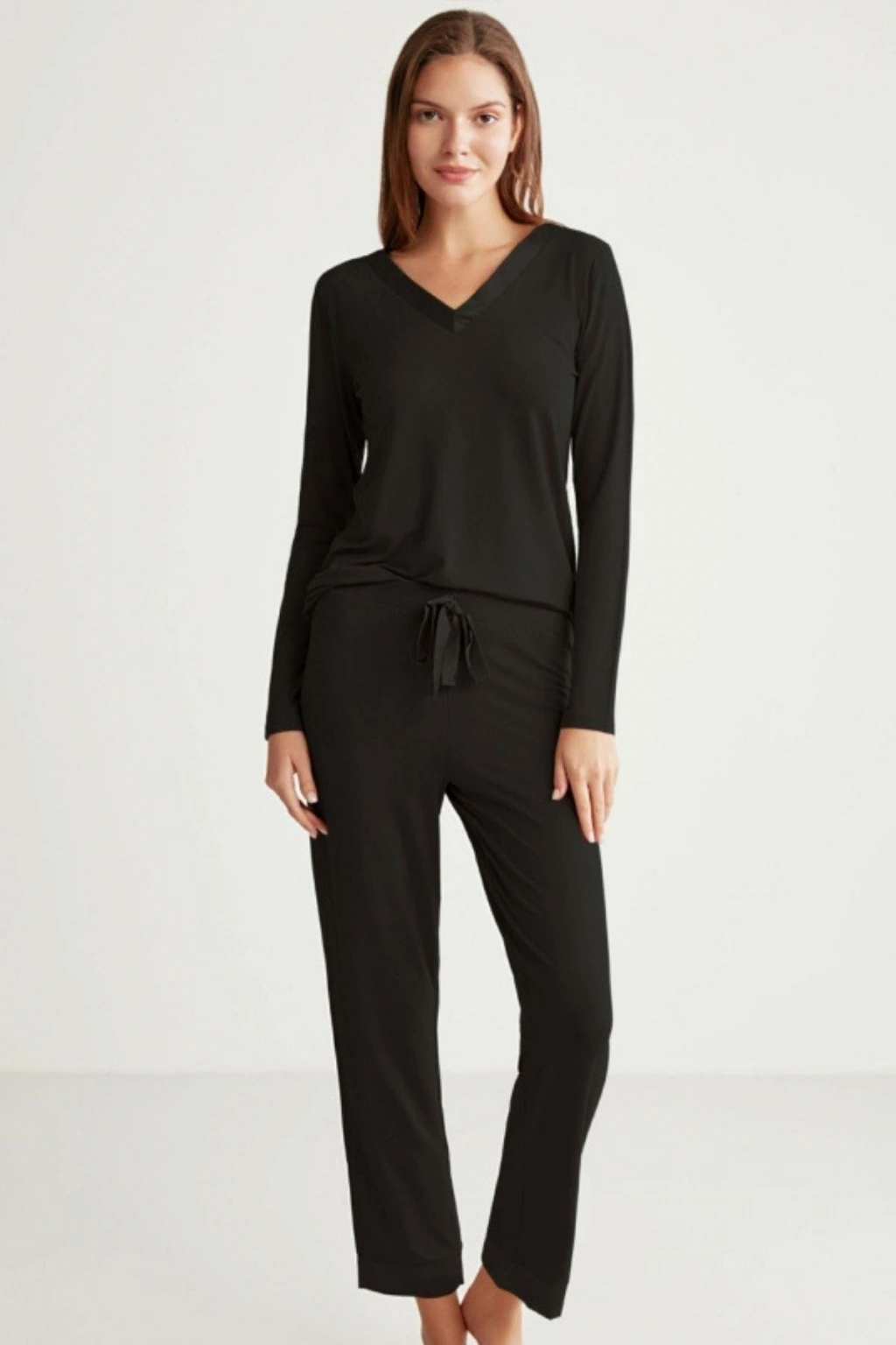 Kadın Siyah Önden Bağlamalı Kolu Ve Paçası Fırfır Detaylı Uzun Kollu Pijama Takımı