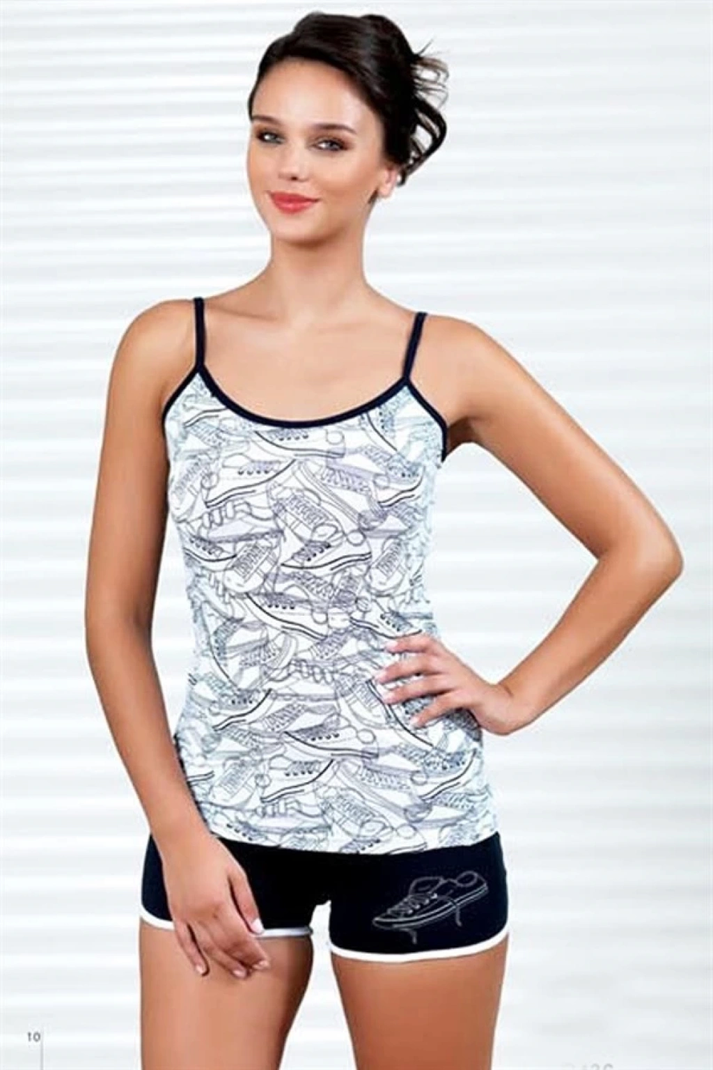 Beyaz Üstüne Kurdela Desenli Fitilli Askılı Şortlu Pijama Takımı