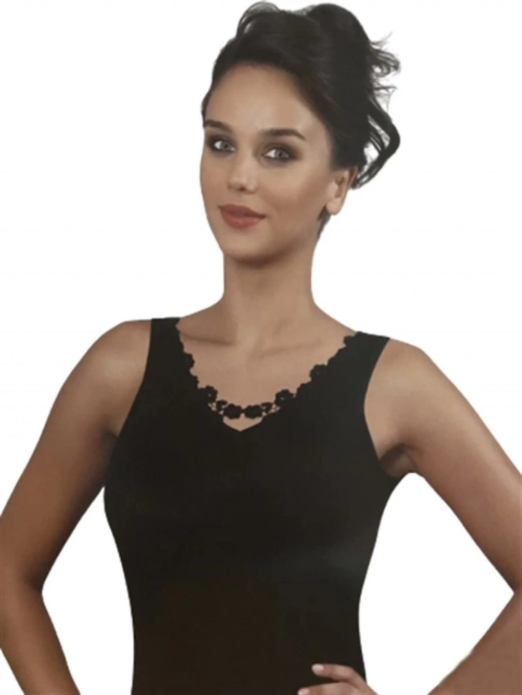 Kadın Siyah Normal Kalıp Dantel Detalı Ince Askılı Oyuk Yaka Atlet