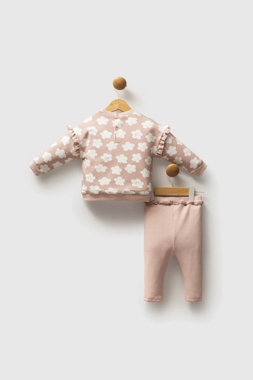 9-12-18-24 Ay Pohh Desenli Uzun Kollu Sweat 2li Kız Erkek Bebek Takımı Krem