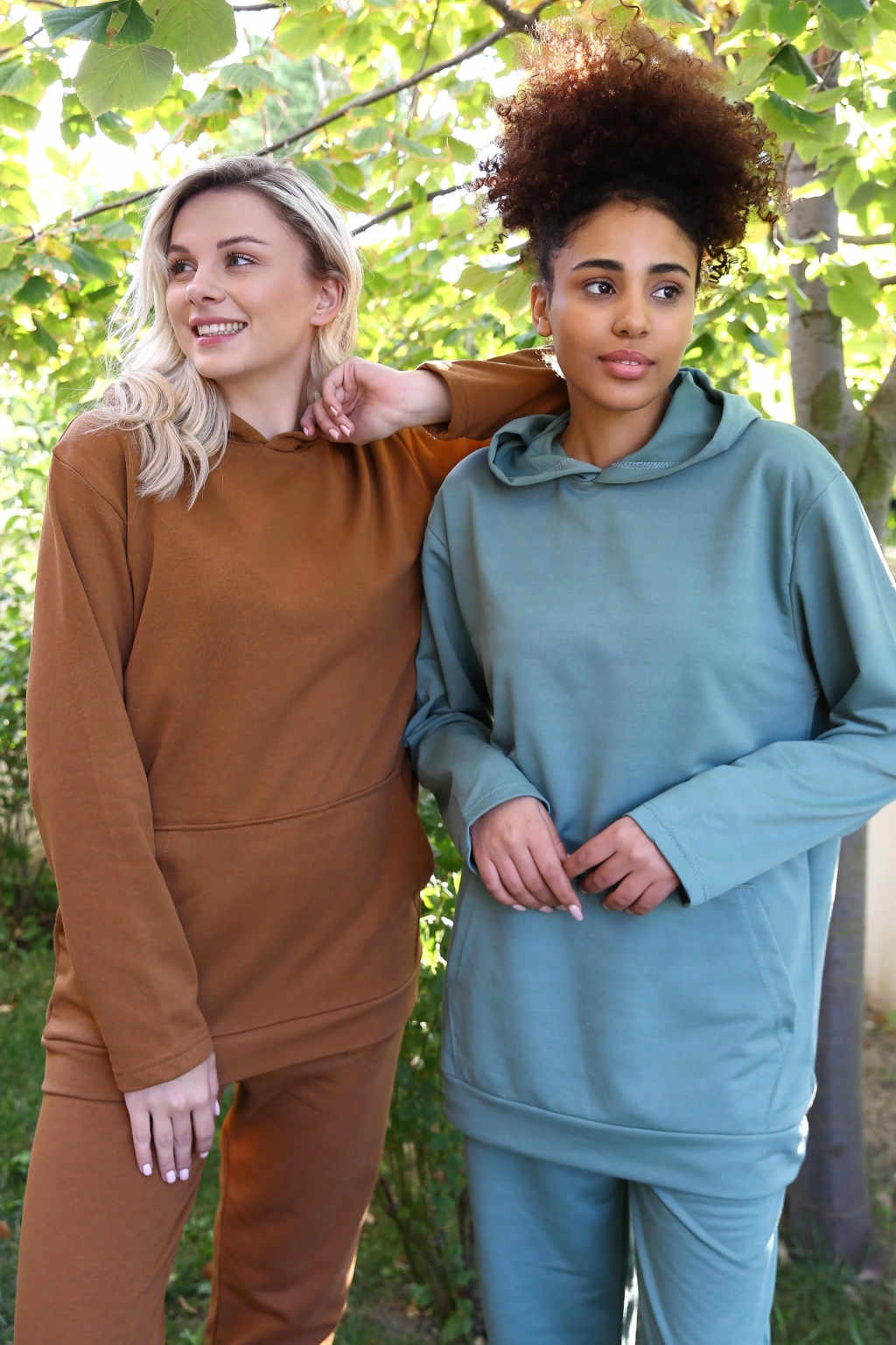 venüsshopping- Kadın Pamuk Kapşonlu Cepli 3 İplik Kahve Eşofman Takım