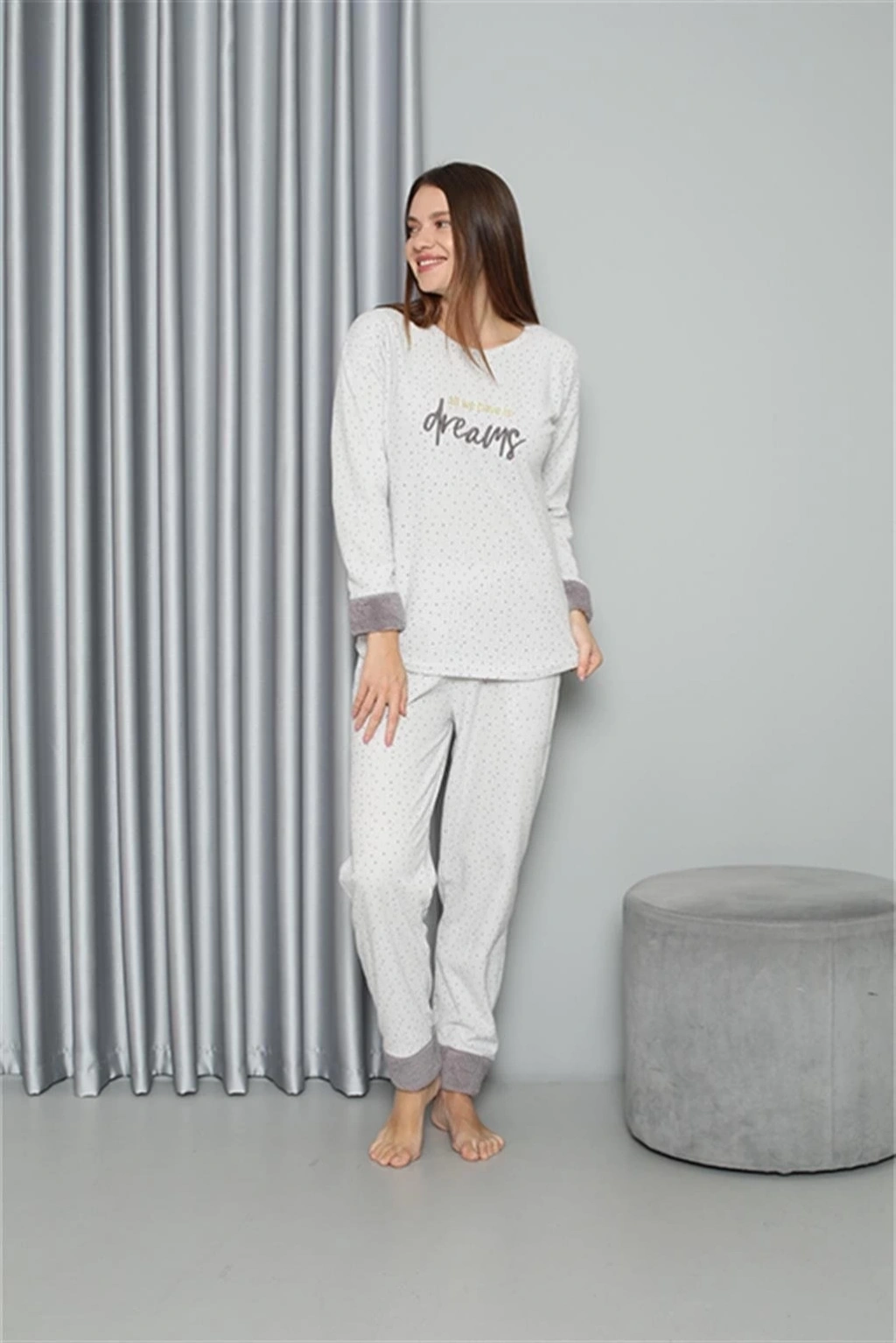 Çamaşır Kenti'nin rahat ve şık tasarımıyla dikkat çeken Polar Kadın Pijama Takımı Ekru, konfor ve şıklığı bir arada sunar.