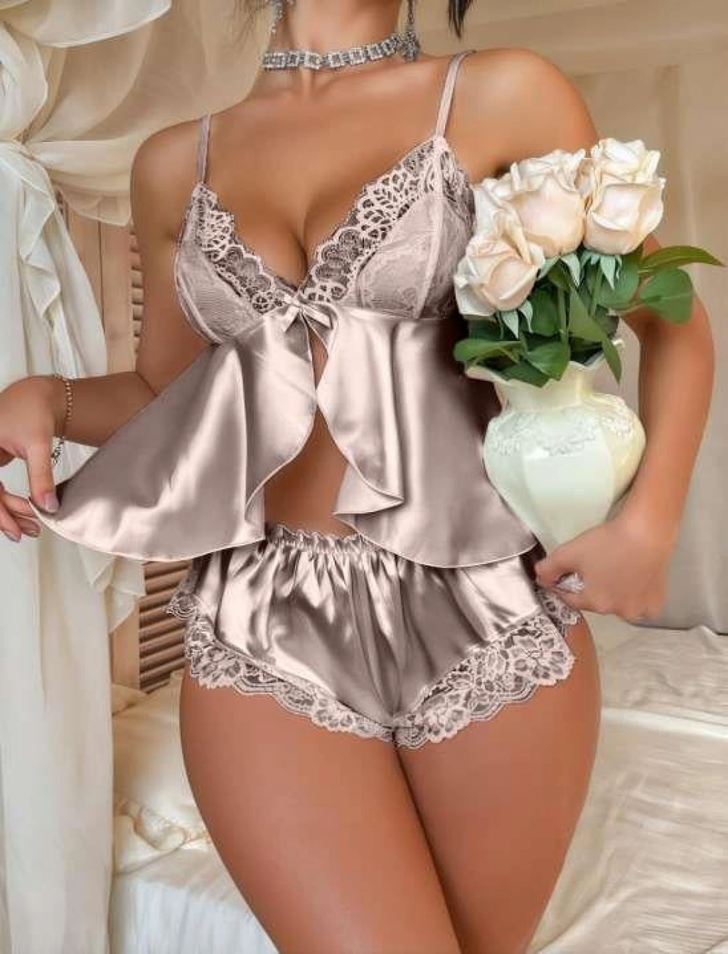 Kadın Ekru Gül Desenli Askılı Dantel Üst Pijama Takımı 2222
