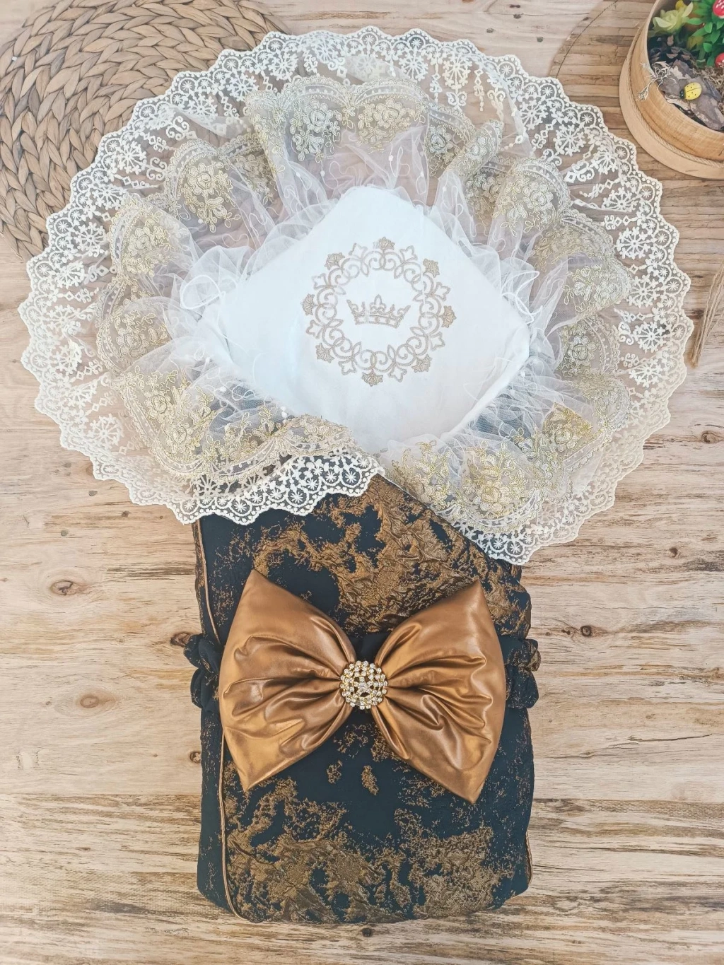 Yenidoğan Kendinden Desenli Krom Fiyonklu Bebek Battaniyesi Kundak Bakır