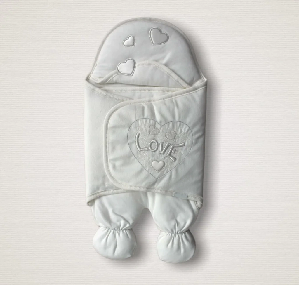 Yenidoğan Lüks Üç Kalp Love Nakışlı Kız Bebek Ayaklı Kundak Bebek Battaniyesi Ekru
