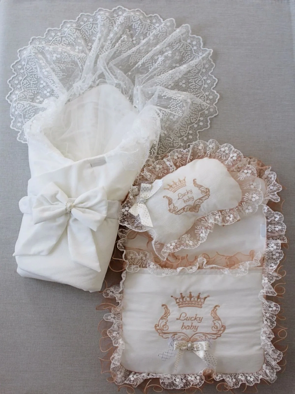 Yenidoğan Nil Taç Nakışlı Kundaklı Trilüks 3lü Alt Açma Seti Bej