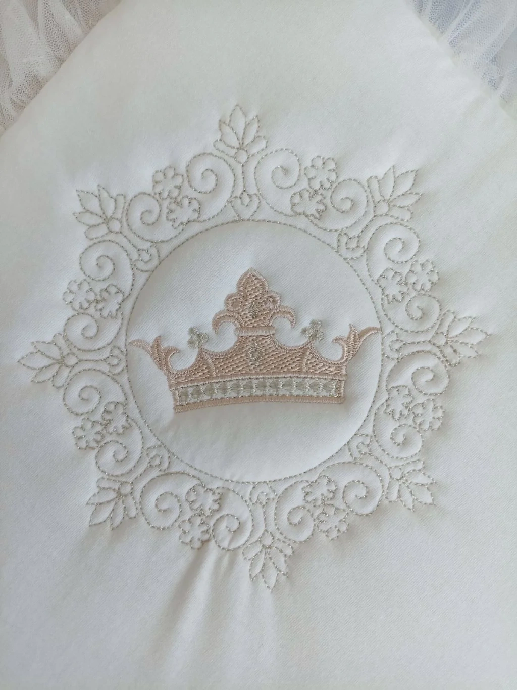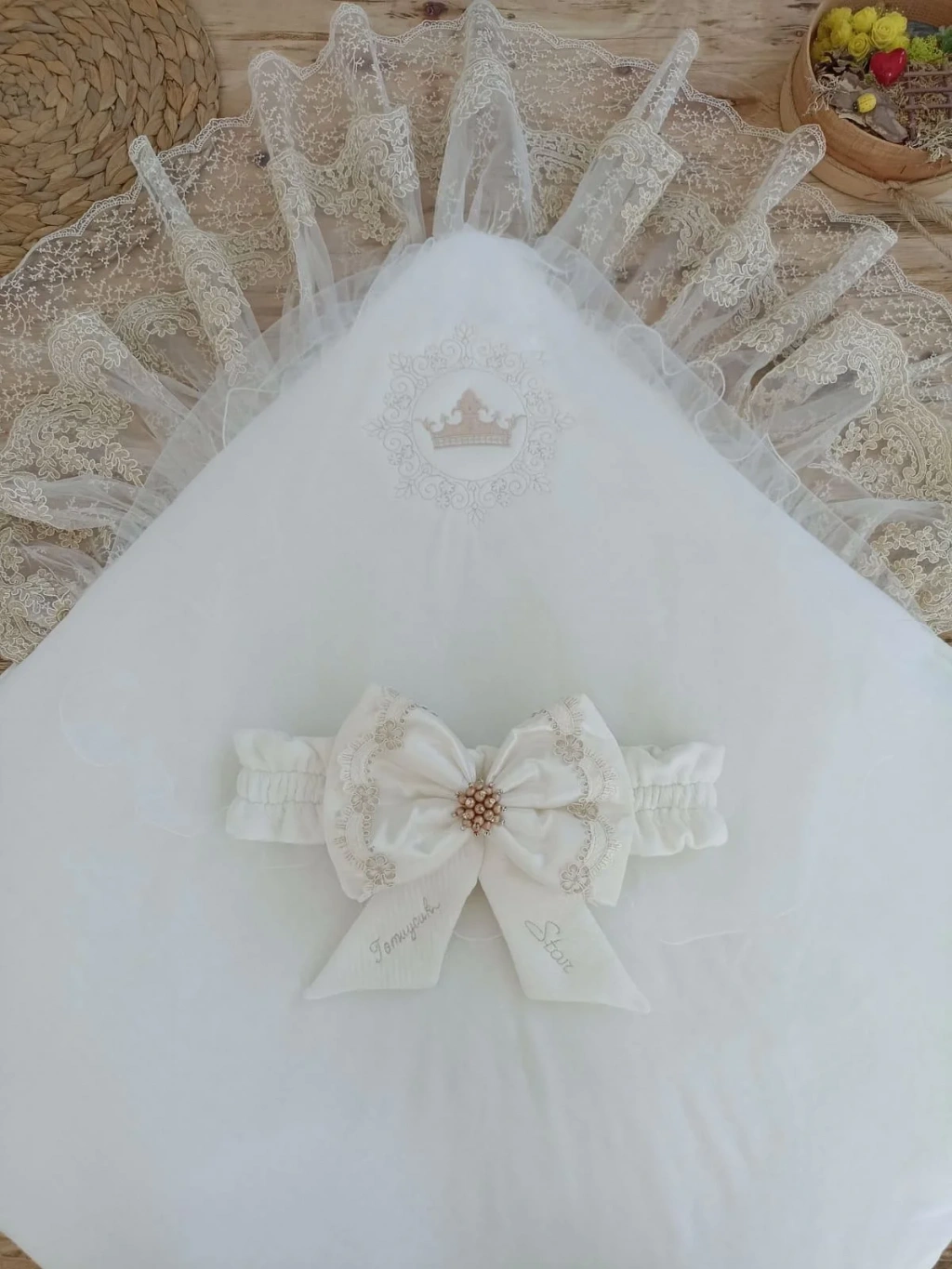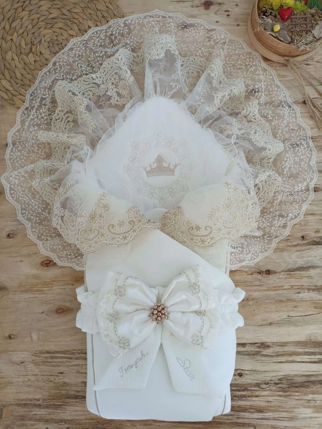 • Yenidoğan Sahra Taç Nakışlı Plazma Taşlı Güpürlü Fiyonklu Duvaklı Trilüks Kundak Bebek Battaniyesi