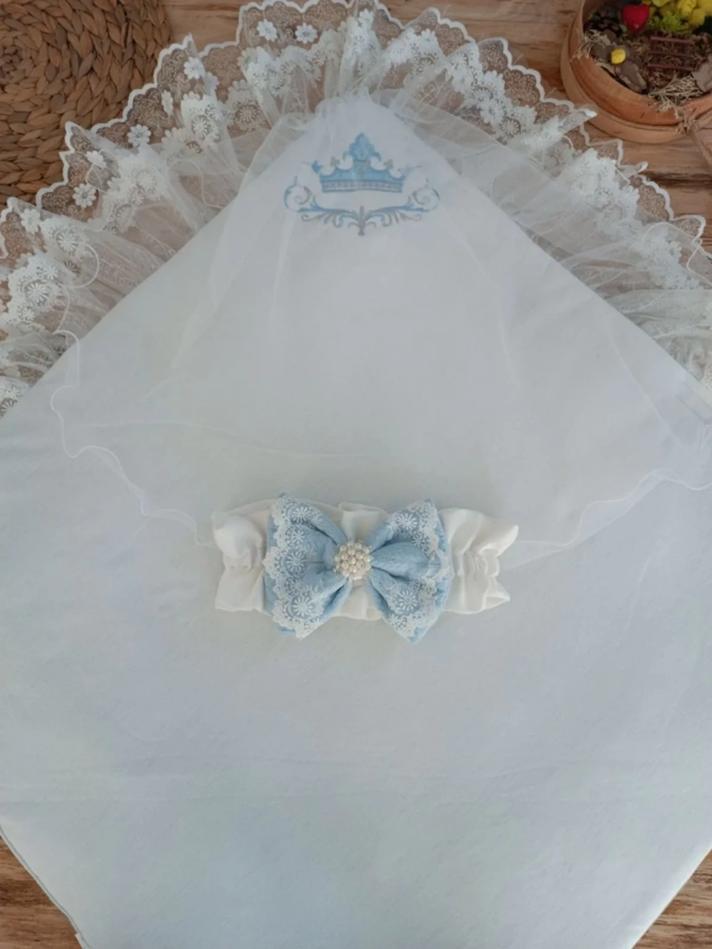 Yenidoğan Teri Cotton Taç Nakışlı Prizma Taş Kundak Bebek Battaniyesi Mavi
