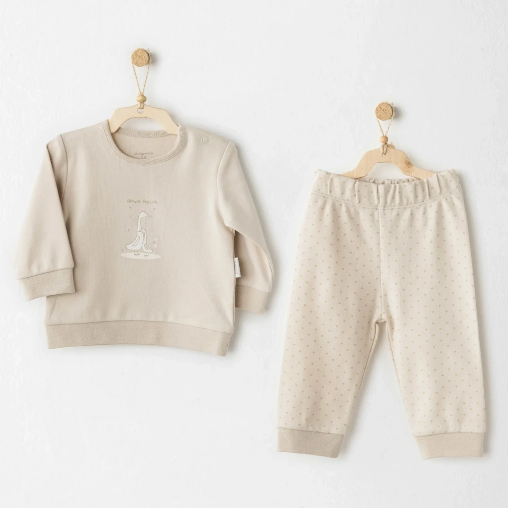 9-12-18-24 Ay Pohh Desenli Uzun Kollu Sweat 2li Kız Erkek Bebek Takımı Krem